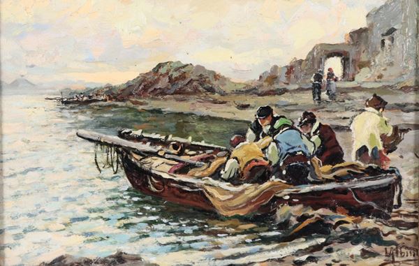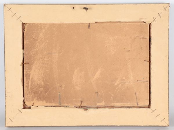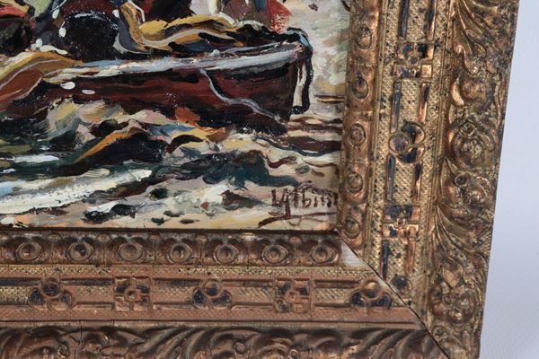 Firmato. "Marina con l'approdo dei pescatori", piccolo dipinto ad olio su cartone pressato in cornice in legno dorato e intagliato