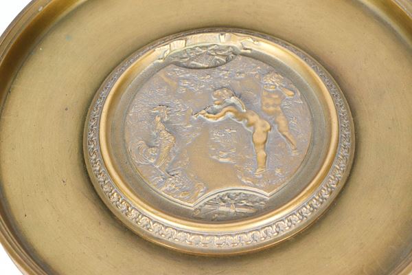 Antica alzata francese Napoleone III in bronzo dorato, cesellato e sbalzato, con medaglione raff.nte "Baccanale di putti", sorretta da base [..]