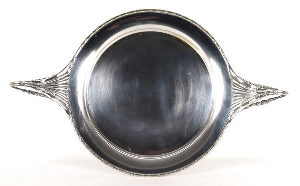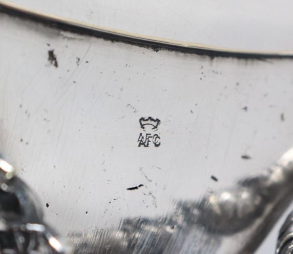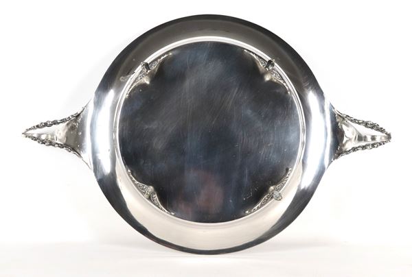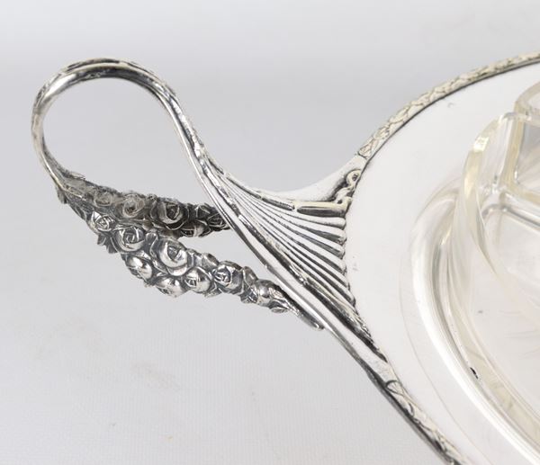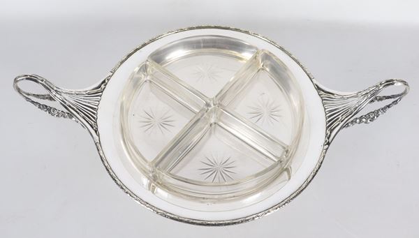 Antica antipastiera a forma tonda in metallo argentato, sbalzato e cesellato con due manici ricurvi e sorretta da quattro piedini, quattro vaschette [..]