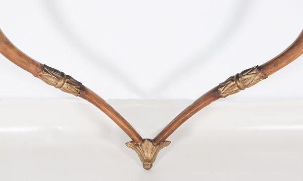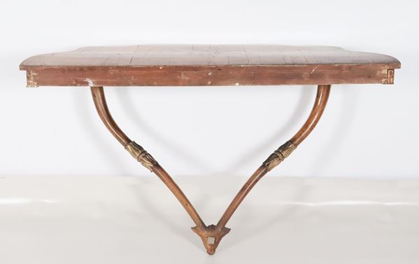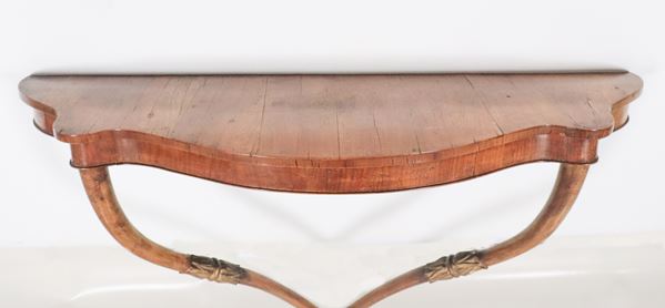 Antica consolle da muro toscana Impero in noce, a forma semitonda centinata con due gambe ricurve e fregi in legno dorato e intagliato