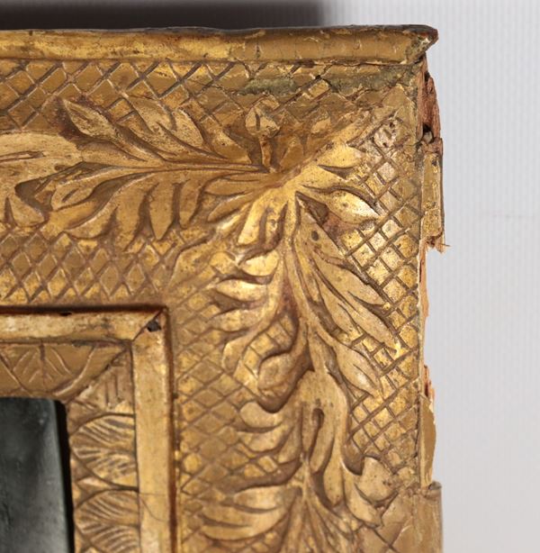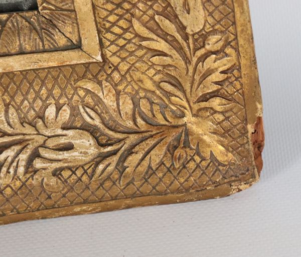 Antica piccola cornice in legno dorato e intagliato a motivi di fiori, foglie e palmette, all'interno specchio al mercurio