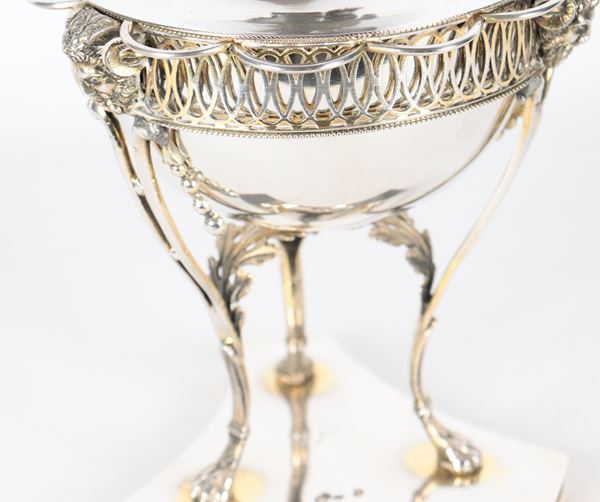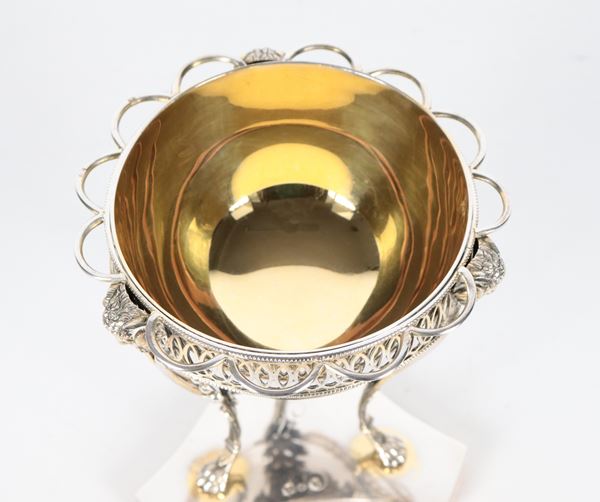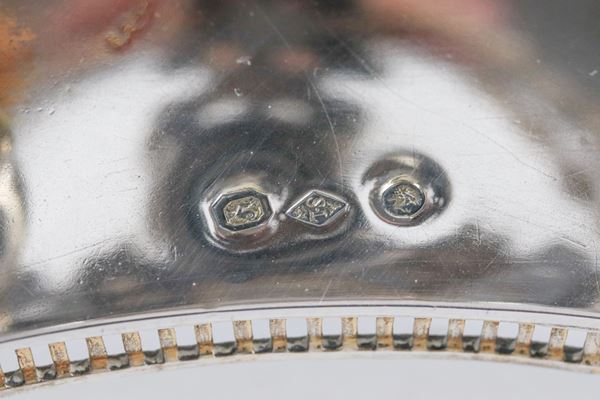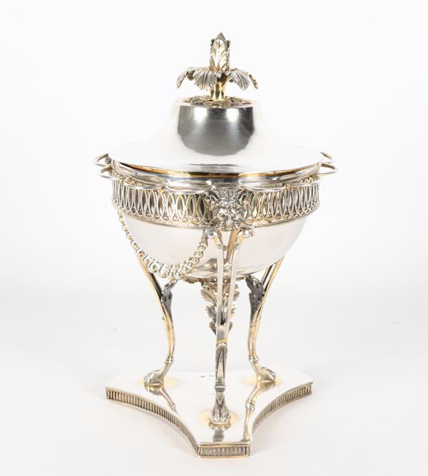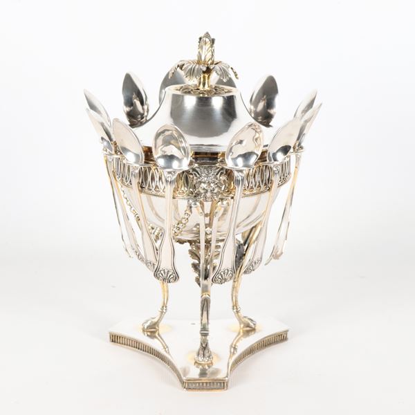 Antica zuccheriera francese in argento Epoca Primo Impero, cesellata e sbalzata con dodici cucchiaini ed interno in vermeil, gr. 1130. Bolli [..]