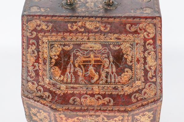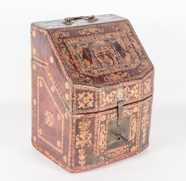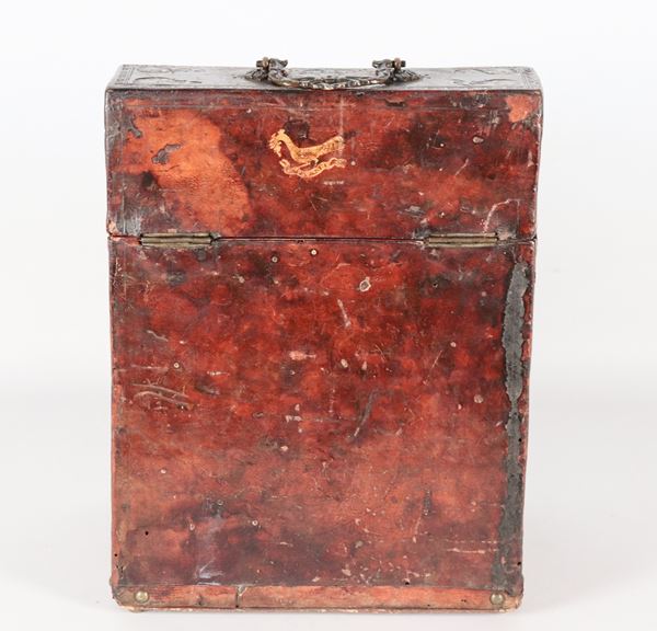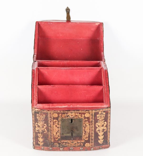 Antico bauletto portacarte da viaggio in cuoio testa di moro, con decorazioni dorate impresse a fuoco a motivi Luigi XIV e stemma cardinalizio [..]