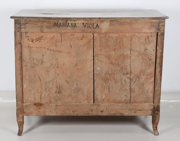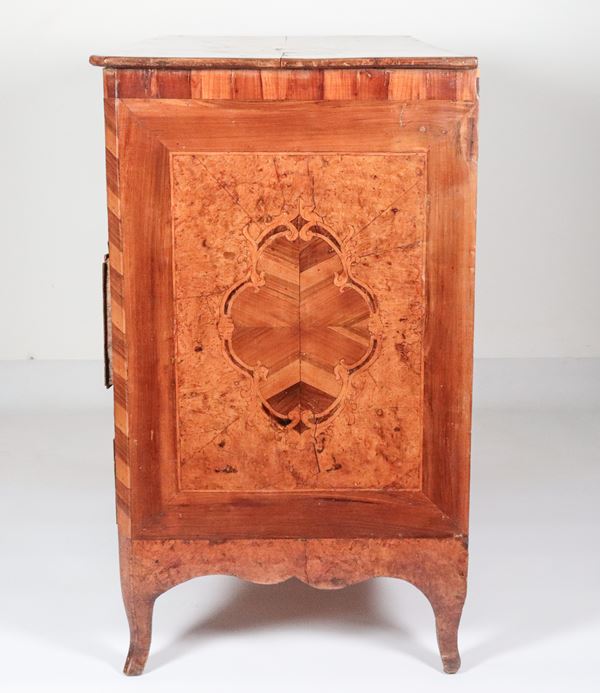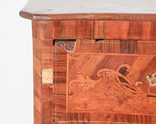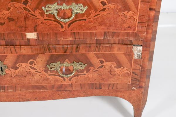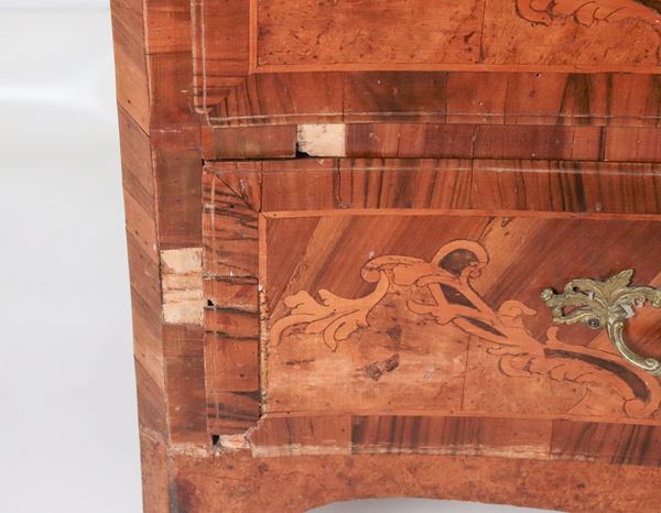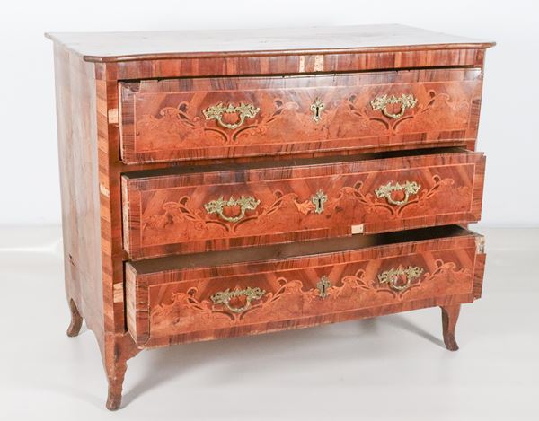 Antico cassettone veneto Luigi XV in noce, con intarsi in bosso a volute floreali intrecciate, tre tiretti, maniglie e bocchette in bronzo dorato [..]