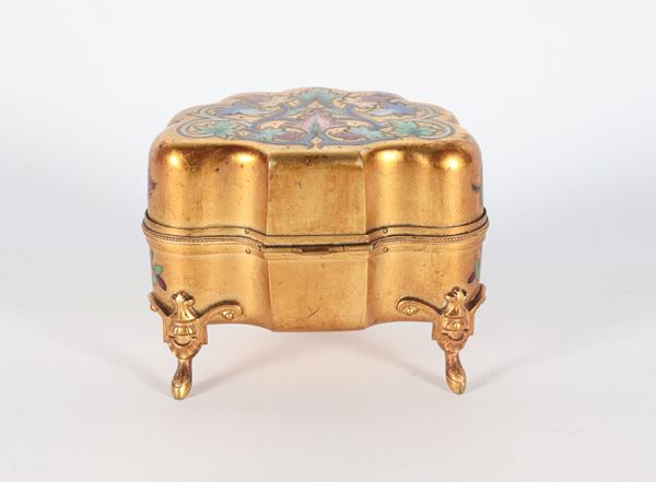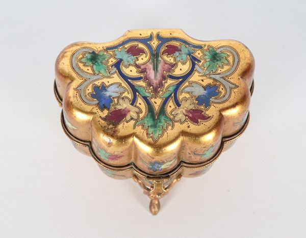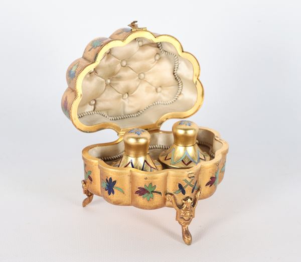 Antico portaprofumo francese in metallo dorato, con coperchio decorato in vari smalti a volute intrecciate floreali, all'interno due flaconi [..]