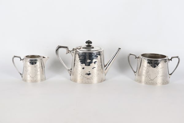 Antico servizio da caffè inglese in sheffield cesellato: caffettiera, lattiera e zuccheriera (3 pz)