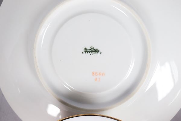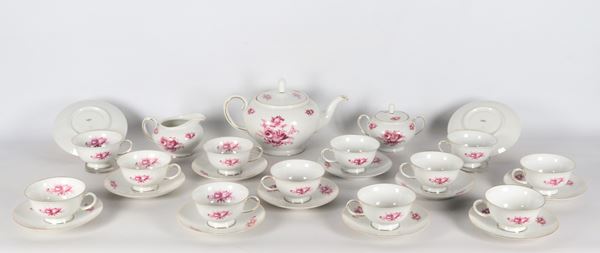 Antico servizio da tè in porcellana bianca di Rosenthal, con decorazioni in rosa antico a motivi floreali: teiera, lattiera, zuccheriera e dodici [..]