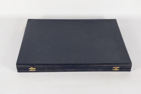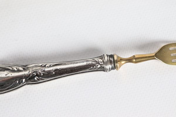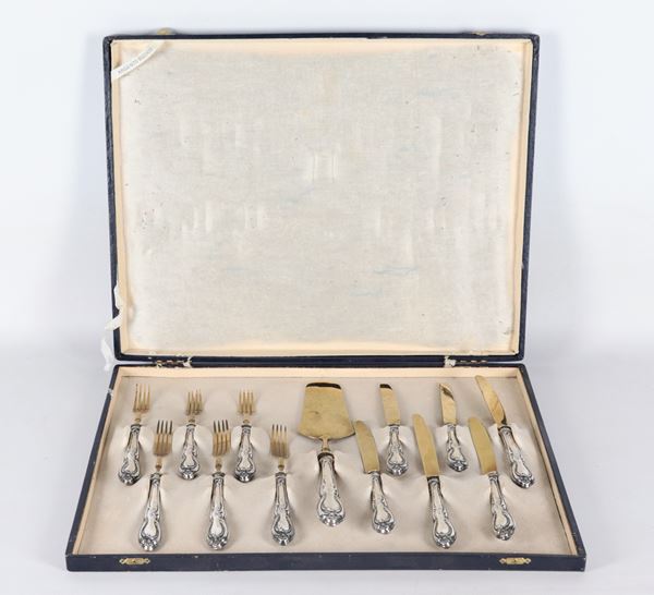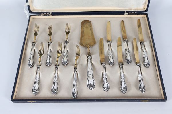 Antico servizio di posate da dolce con manici rivestiti in argento cesellato e sbalzato, forchette e lame in vermeil, annesso astuccio (13 pz [..]