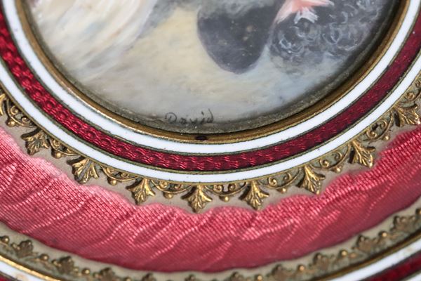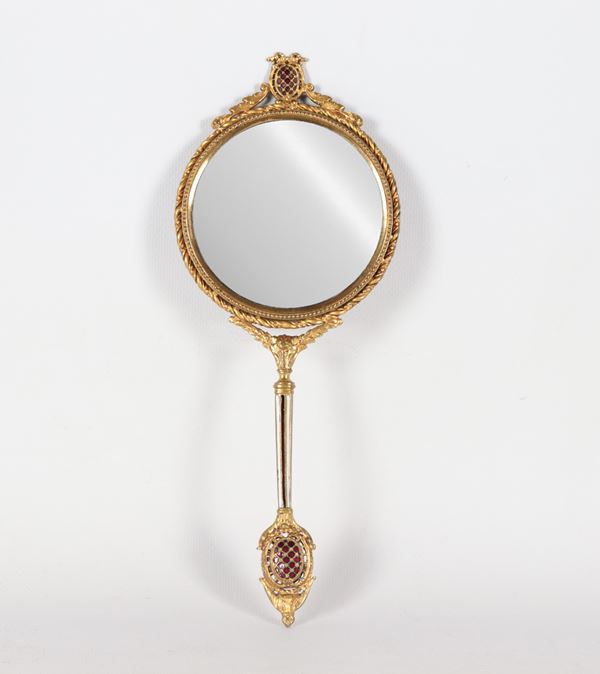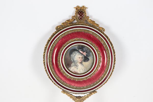 Antico specchio da toletta francese in metallo dorato e cesellato con guarnizioni in smalto rosso, al centro miniatura tonda dipinta "Ritratto [..]