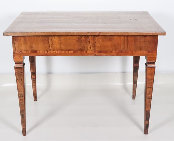Antico tavolo da centro veneto Luigi XVI in noce e ulivo, a forma rettangolare con piano intarsiato a motivi geometrici e stelle agli angoli, [..]
