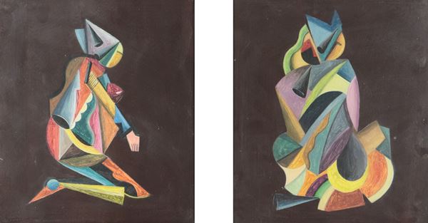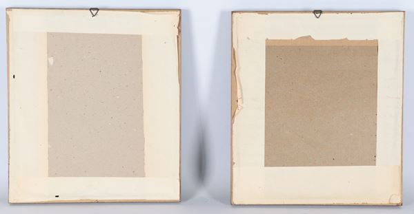 "Pagliacci", coppia di piccoli dipinti a tecnica mista su fondo nero, cornici in legno