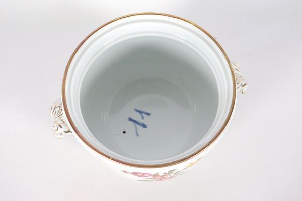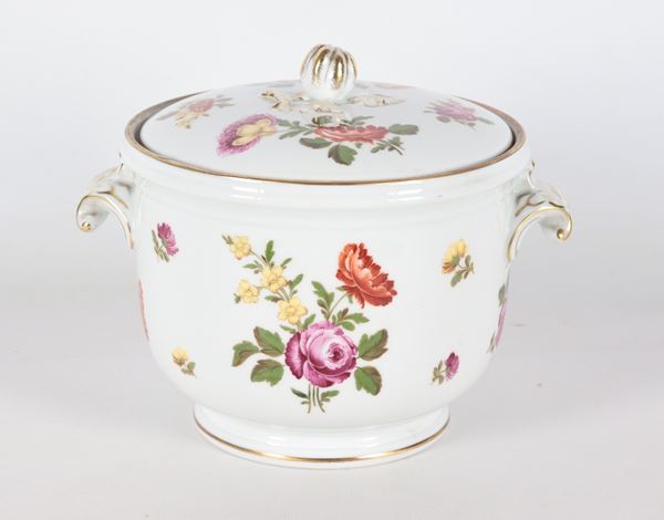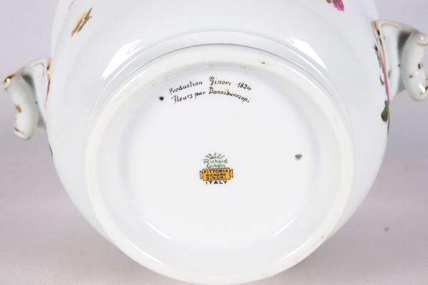 Cachepot con coperchio in porcellana bianca Richard Ginori, con decorazioni variopinte a motivi di mazzetti di fiori