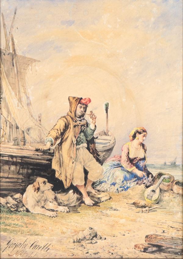 Firmato. "Il riposo dei pescatori", piccolo acquarello su carta incollata a tela in cornice dorata e laccata