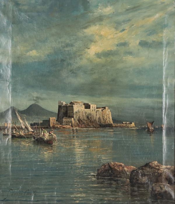 Firmato. "Veduta del Golfo di Napoli con Castel dell'Ovo, barche di pescatori e il Vesuvio sullo sfondo", dipinto ad olio su tela in cornice [..]