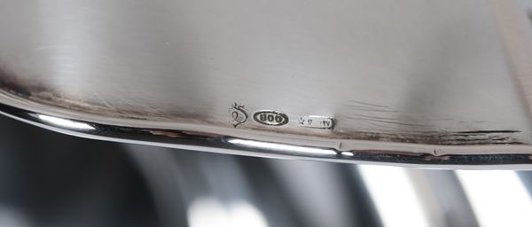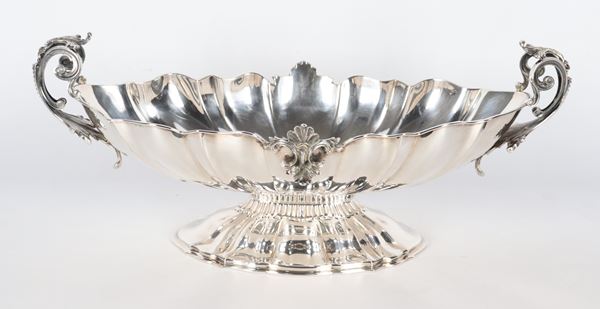 Centrotavola ovale in argento, con bordo sagomato, cesellato e sbalzato a motivi di conchiglie e due manici ricurvi, gr. 960