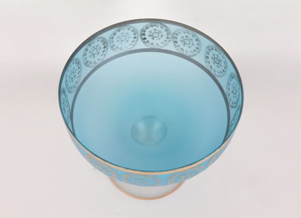 Coppa in cristallo celeste con decori dorati a motivi geometrici