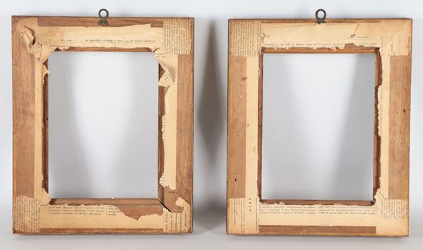 Coppia di antiche piccole cornici in legno dorato e intagliato a volute di tralci e grappoli d'uva