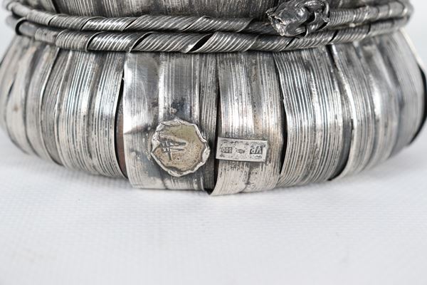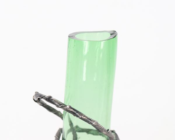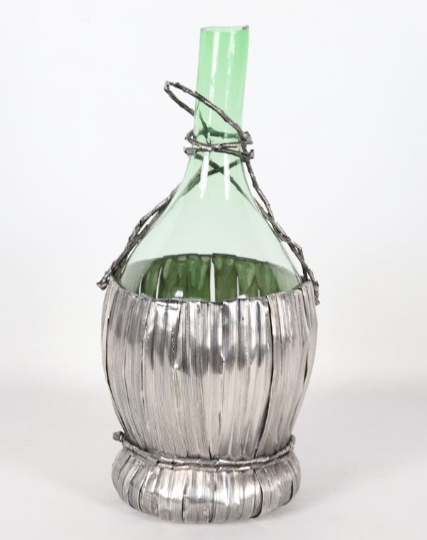 Fiasco in vetro rivestito in argento, lieve sbeccatura al collo del fiasco