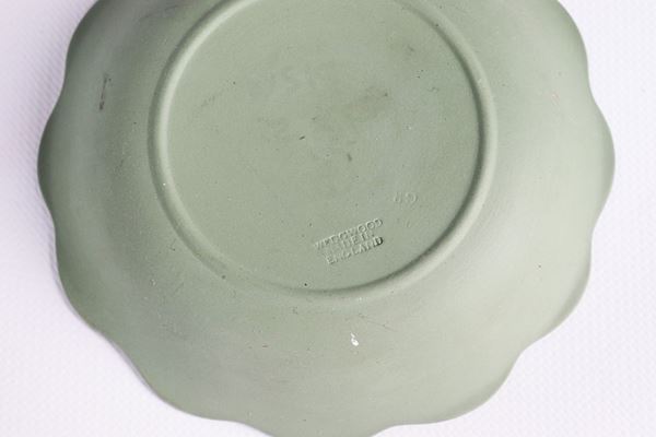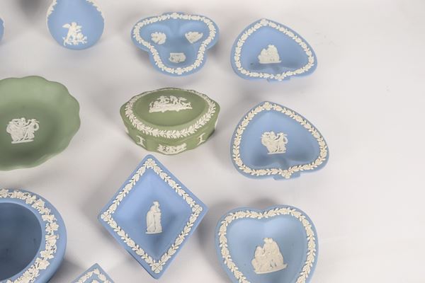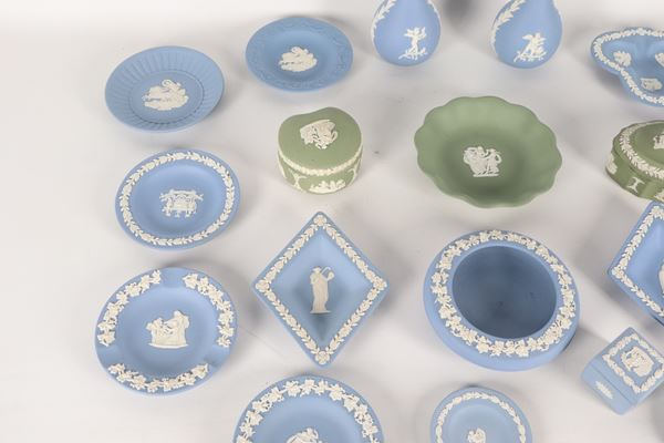 Lotto di venti piccoli oggetti in porcellana Wedgewood celeste e verde con decorazioni a motivi neoclassici