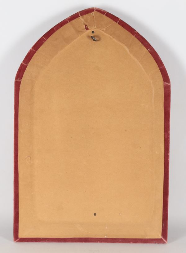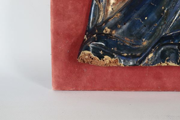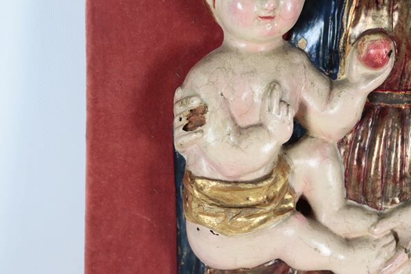 "Madonna col Bambino che regge una mela", antica scultura ad altorilievo in legno policromo, su supporto a sesto ovale in velluto rosa antico. [..]