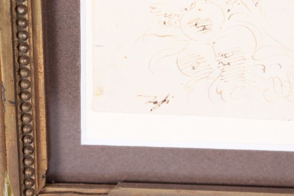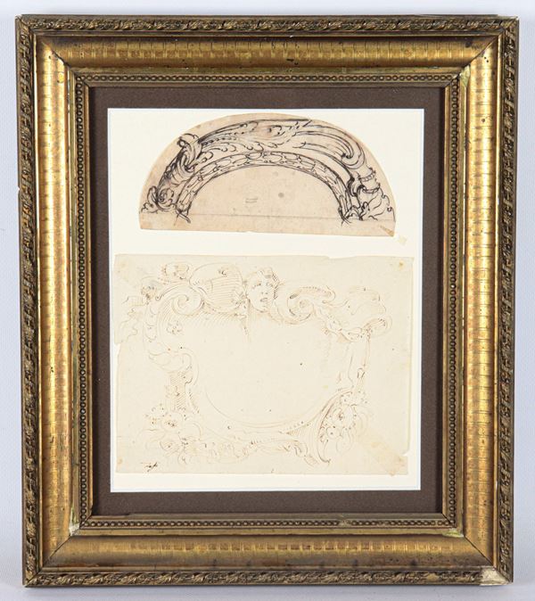 "Soggetti architettonici", lotto di due piccoli disegni a china su carta riuniti in un'unica cornice in legno dorato e intagliato
