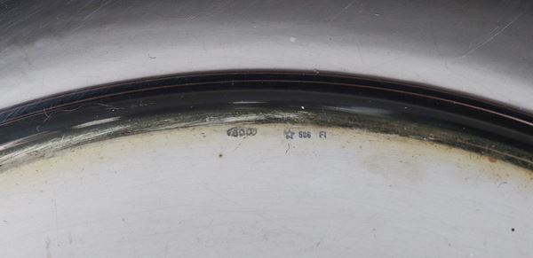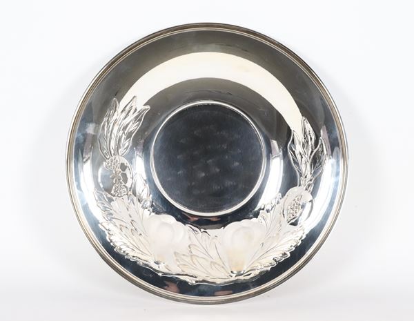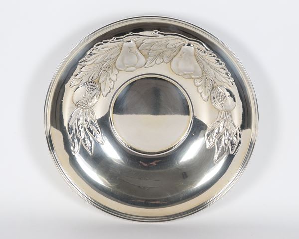 Piccola fruttiera tonda in argento con bordo sbalzato e cesellato a motivi di frutta, gr. 345