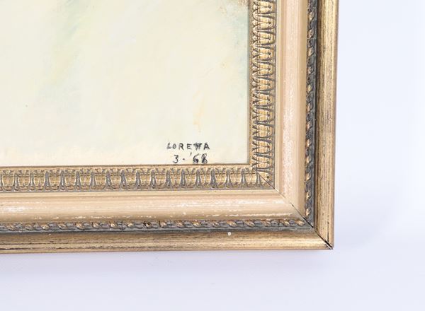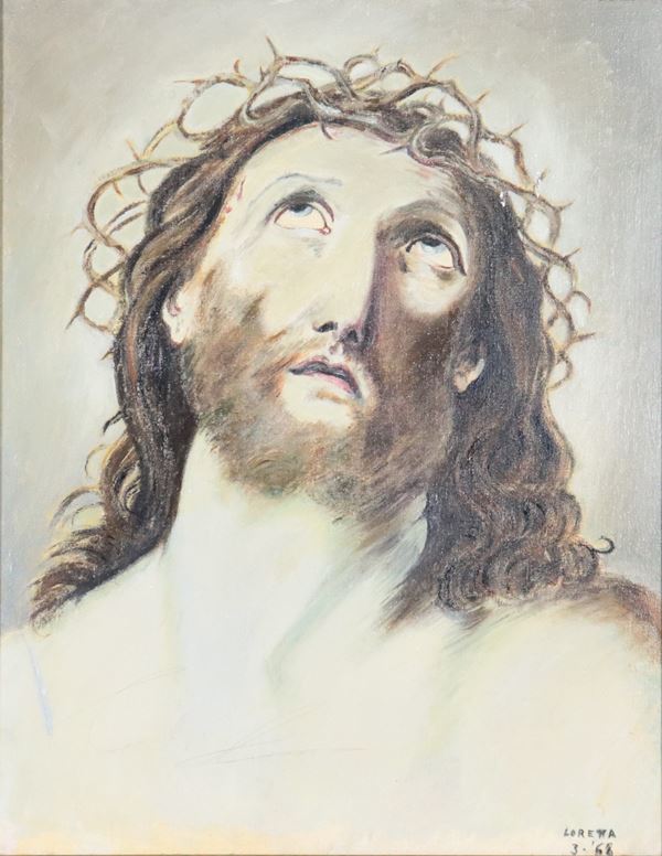 Firmato e datato 1968. "Ecce Homo", dipinto ad olio su tela in cornice decapè intagliata
