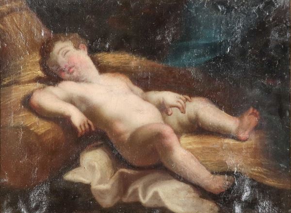 "Gesù Bambino dormiente", piccolo dipinto ad olio su tela in cornice in legno dorato