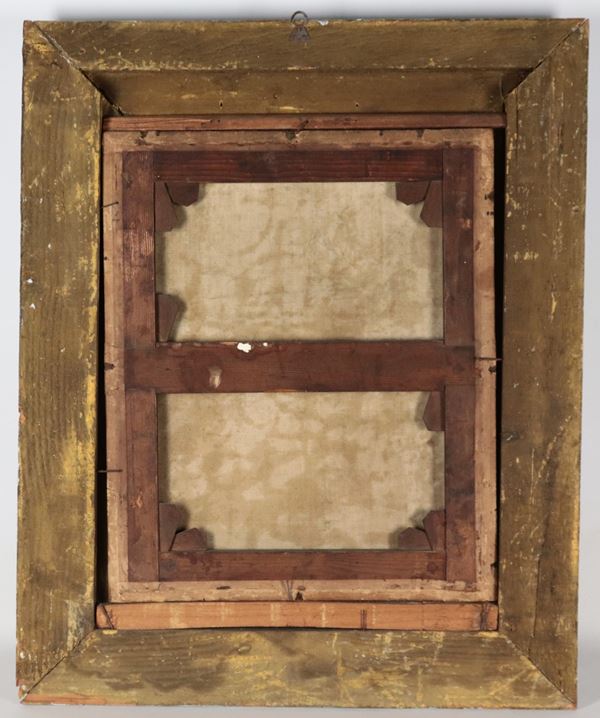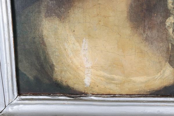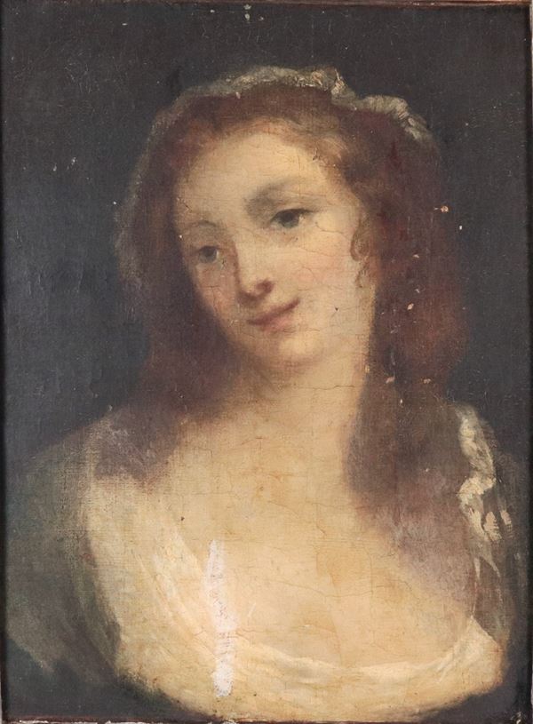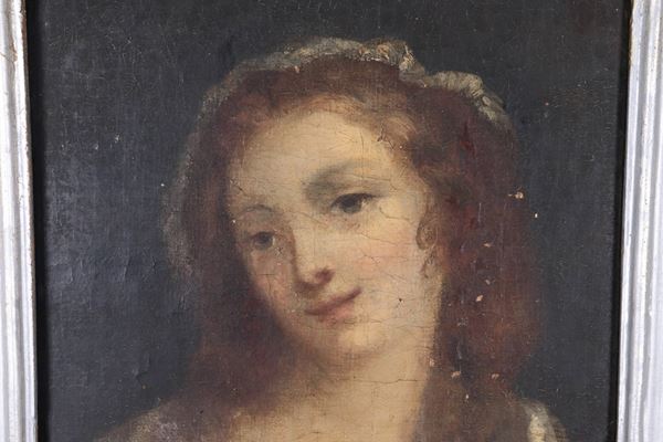 "Ritratto di ragazza con cuffietta", piccolo dipinto ad olio su tela in antica cornice in legno argentato. Difetti alla tela