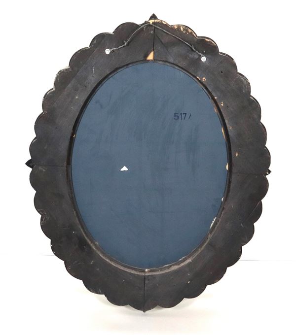 Specchiera veneta ovale in vetro soffiato di Murano, con decorazioni a motivi di fiori e foglie. Anni '20-'30