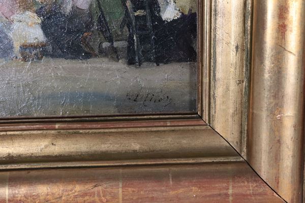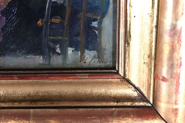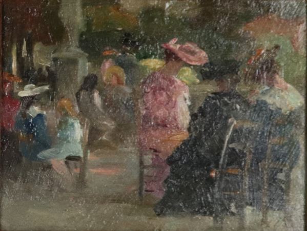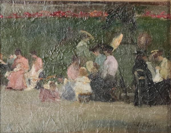 Firmati. "Signore al parco", coppia di piccoli dipinti ad olio su cartone in cornici in legno dorato