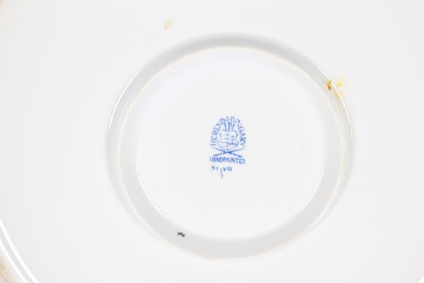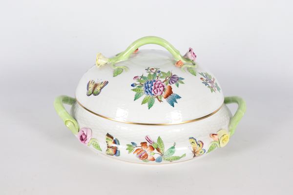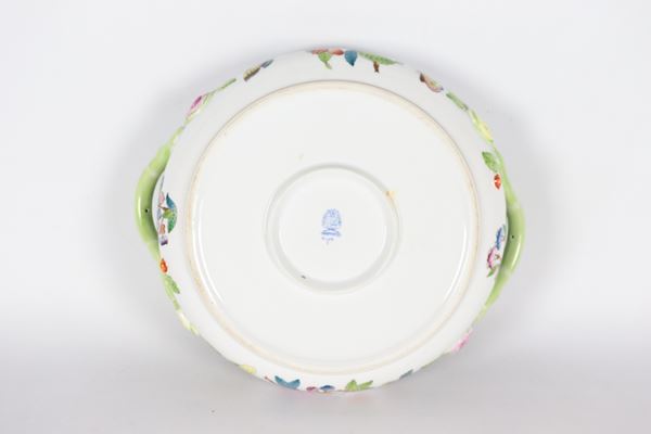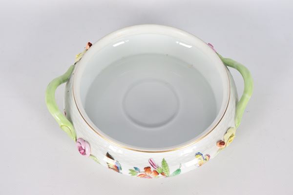 Zuppiera con due manici in porcellana bianca di Herend, con decorazioni variopinte a rilievo a motivi di mazzetti di fiori e farfalle
