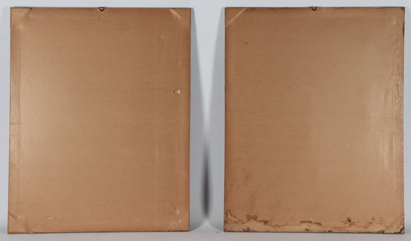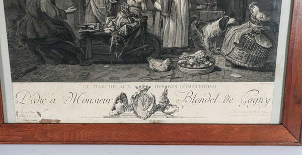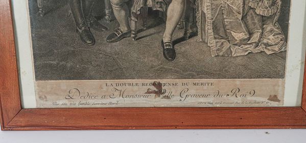 coppia di antiche incisioni francesicornici in noce, cm 56,5 x 43 ciascuna.