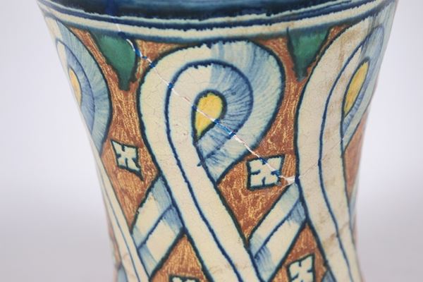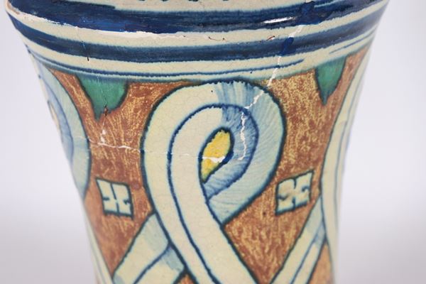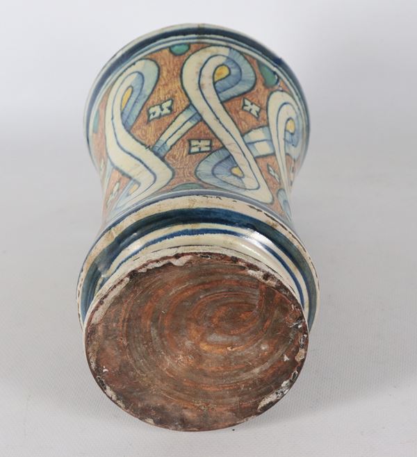 Albarello da farmacia in maiolica siciliana, decoro policromo a motivi geometrici