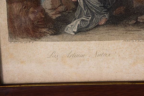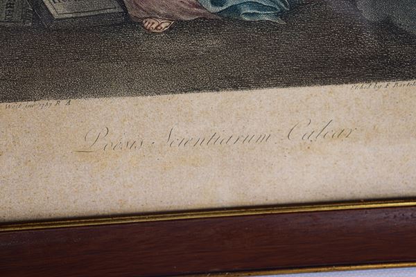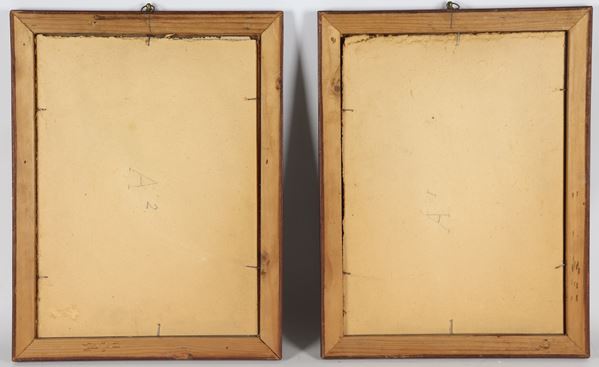 coppia di antiche incisioni neoclassiche a coloricornici in noce e passepartout, cm 32 x 23,5 ciascuna.