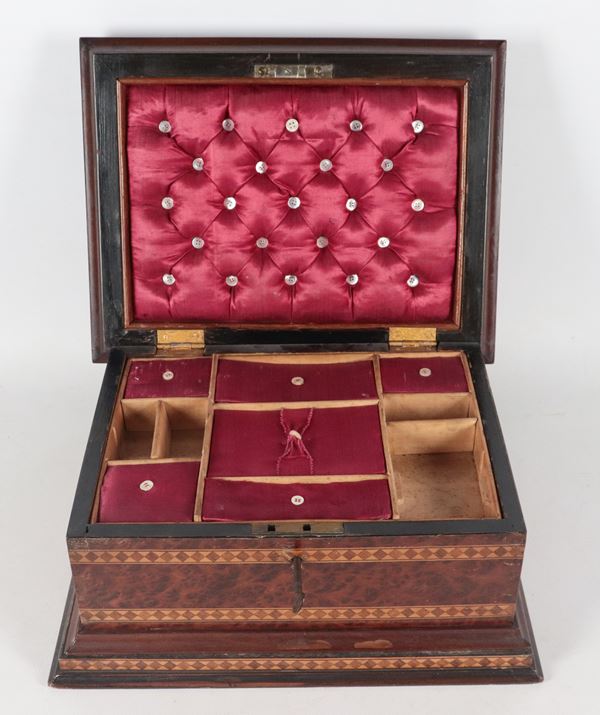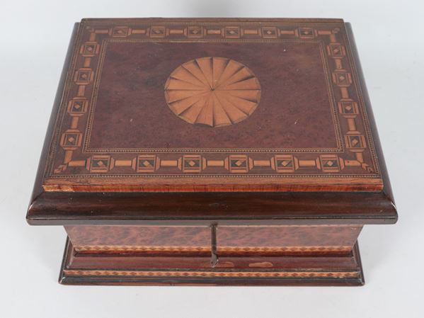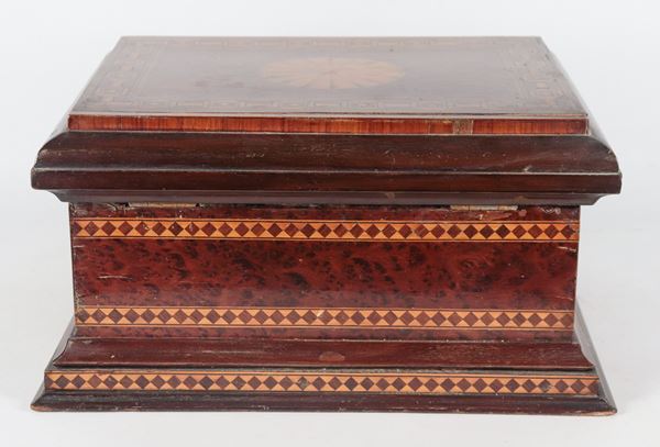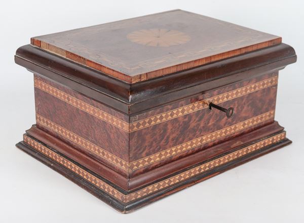 Antica grande scatola in noce, radica di tuja e legno satinato, con intarsi geometrici e scomparti all'interno