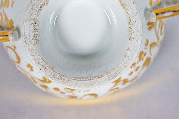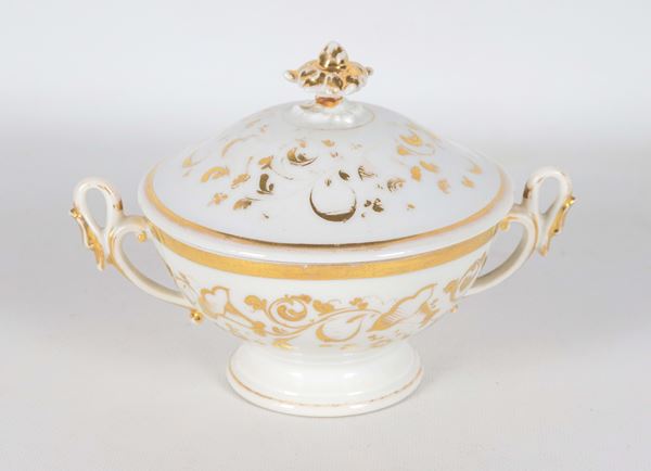 Antica zuccheriera francese Luigi Filippo in porcellana bianca, decoro in oro zecchino ad intrecci floreali