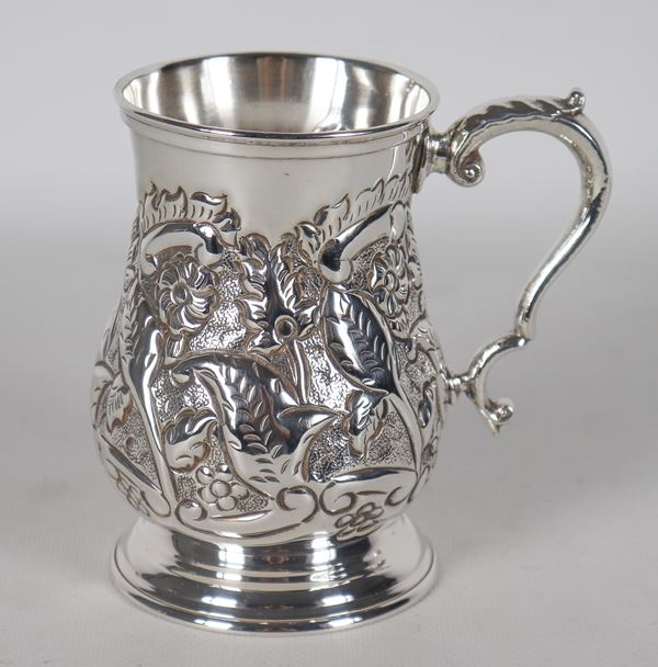 Antico boccale in metallo argentato, cesellato a motivi di ghirlande floreali e frutta