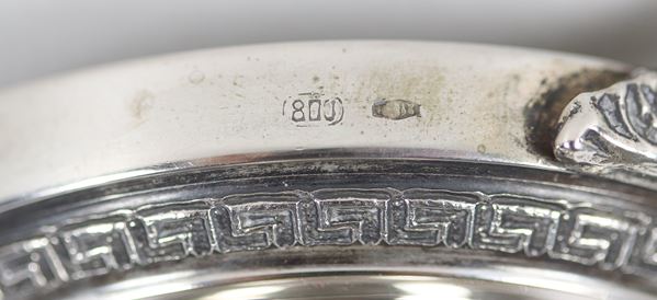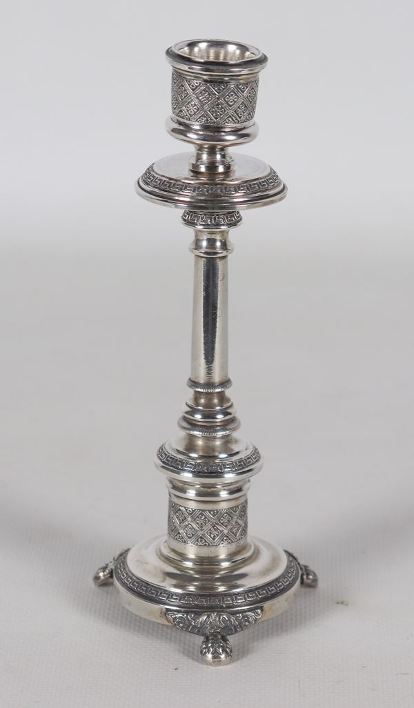 Antico piccolo candeliere in argento cesellato e sbalzato a motivi Impero, gr. 148