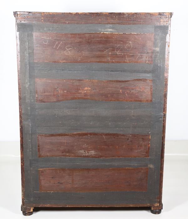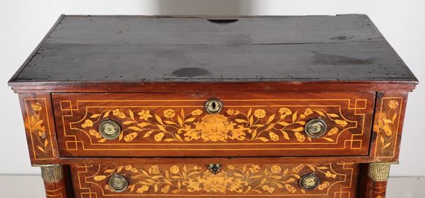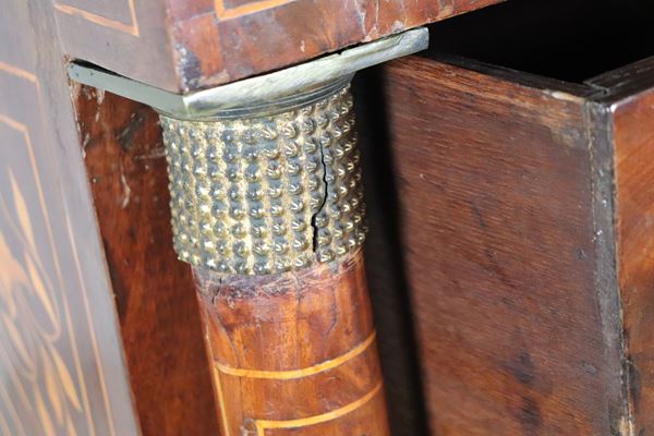 Montanti a colonne Impero e sette tiretti. Piano difettato, cm 103,5 x 50 x 143 h.