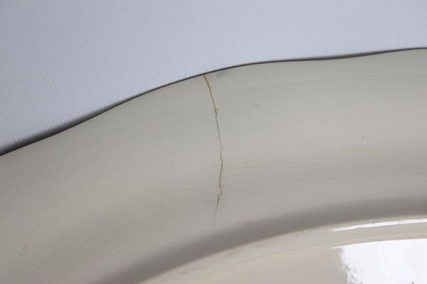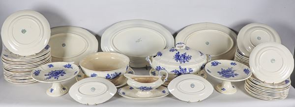 12 fondine, 36 piatti piani, 12 piatti piccoli, 1 zuppiera, 1 insalatiera, 2 piatti tondi da portata, 3 piatti ovali da portata di cui uno con lieve felatura al bordo, 2 burriere, 1 salsiera e 2 alzate per frutta.