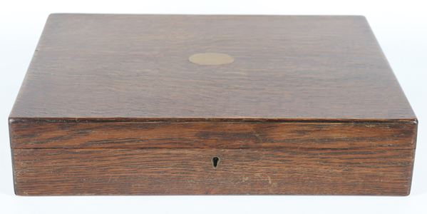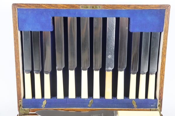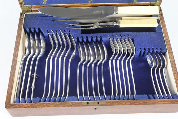 annesso astuccio originale in rovere. 4 cucchiai grandi, 6 forchette grandi, 6 coltelli grandi, 6 cucchiai piccoli, 6 forchette piccole, 6 coltelli piccoli, 4 cucchiaini da tè e 3 posate per arrosti.