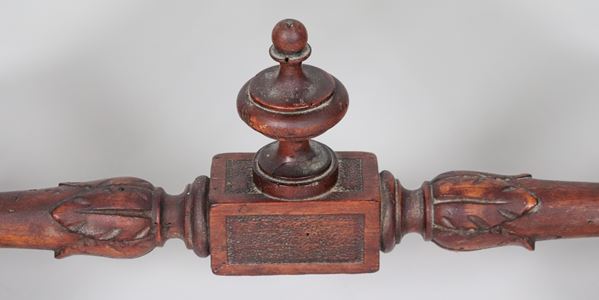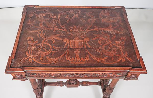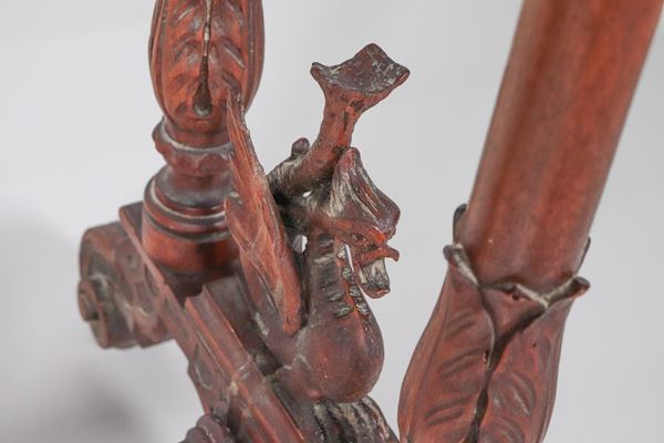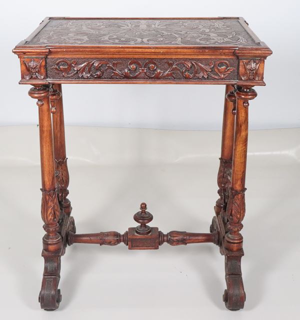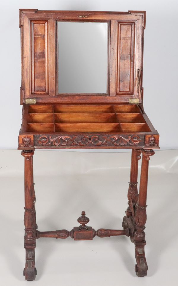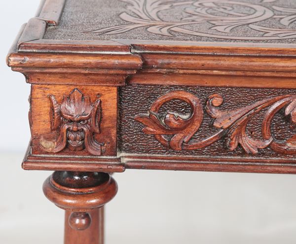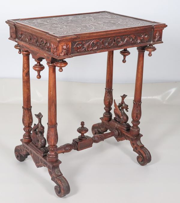 Antico tavolino da lavoro Luigi Filippo in noce, intagliato a volute floreali, grifoni e mascheroni