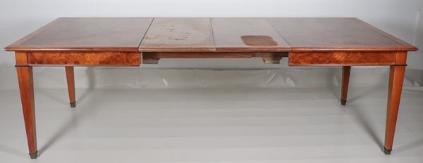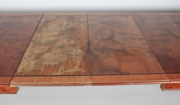 Antico tavolo da pranzo allungabile in radica di tuja con intarsio a fascia sul piano