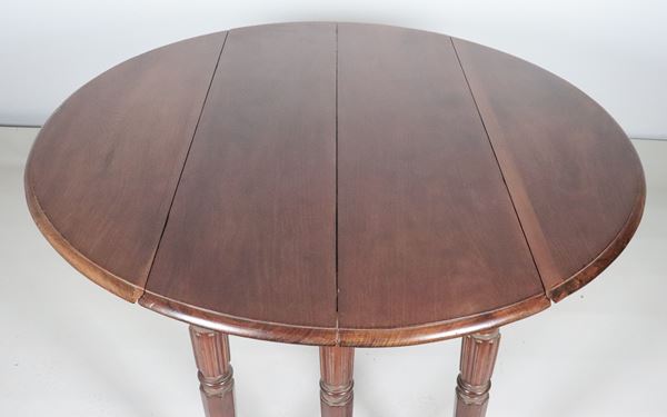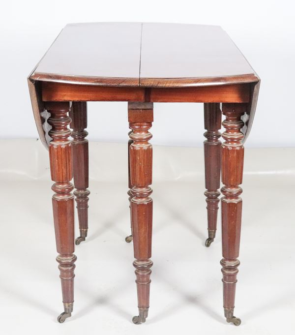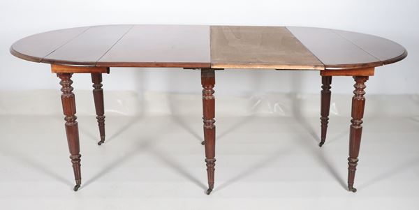 in mogano massello con sei gambe a colonne tornite e baccellate, due prolunghe di cui una grezza. Chiuso cm 58 x 113 x 78 h, aperto con prolunghe cm 213 x 113 x 78 h.