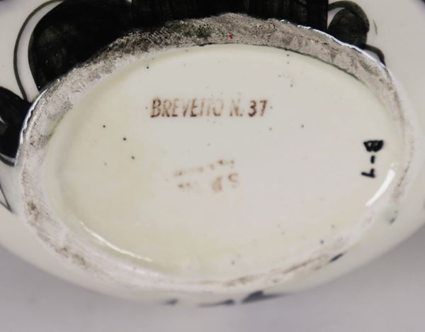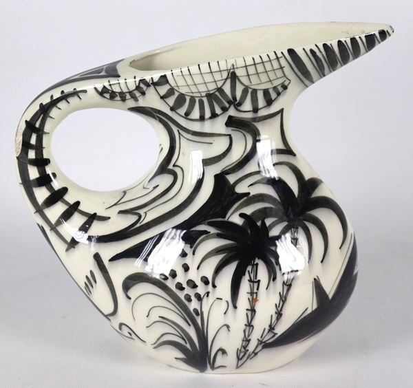 Brocca in ceramica smaltata e porcellanata, con decori in nero a motivi astratti su fondo bianco