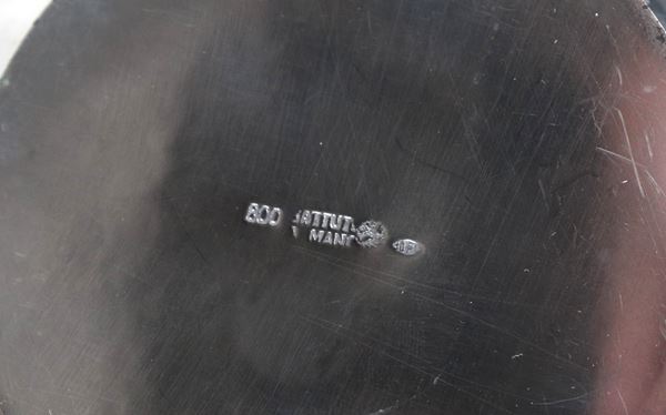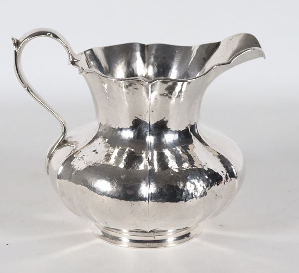 Brocca per acqua in argento martellato, cesellato e sbalzato, manico ricurvo. Gr. 545