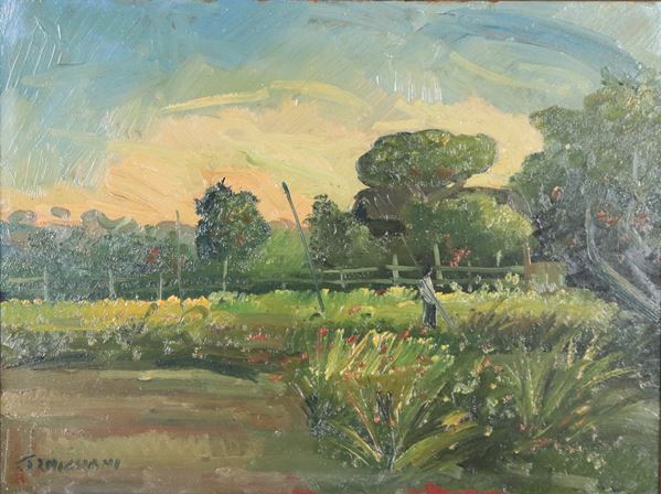 Firmato. "Paesaggio di campagna con staccionata e contadina"
