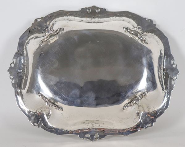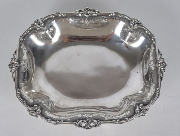 Centrotavola in argento cesellato e sbalzato con bordo traforato , sorretto da quattro piedini, gr. 485