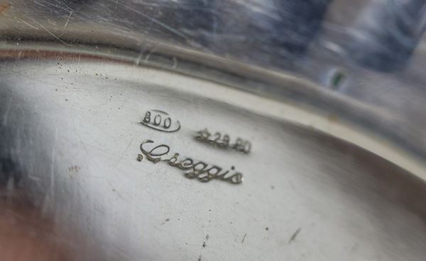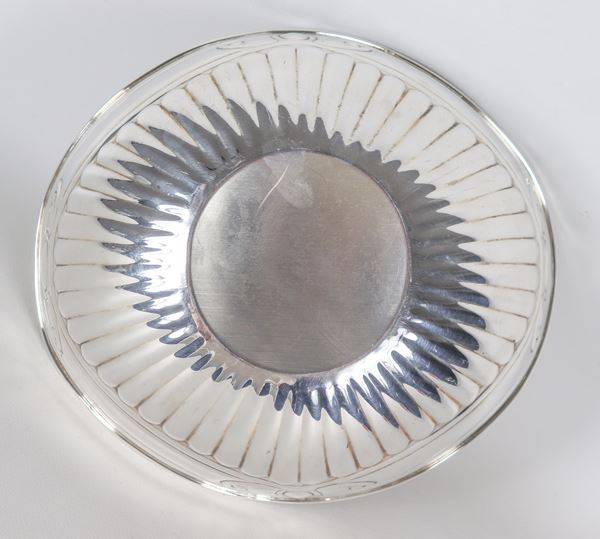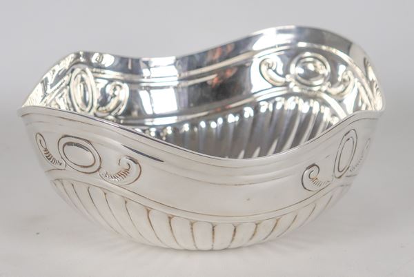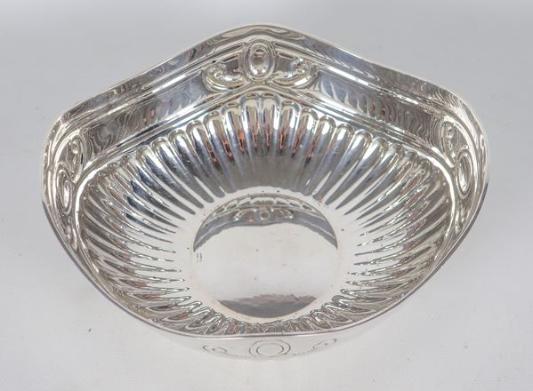 Cesto in argento con bordo sagomato, cesellato e sbalzato a baccellature, gr. 410